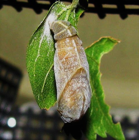 夕方… 蛹が色づいてる事から、羽化間近なのかもしれない。 寄生されていなければ… お尻の辺りの 『くた〜っ』 って感じが若干嫌な予感もさせるけど… その部分だけが茶色いってのもなんとなく嫌だよね(汗) ま、信じましょう! |