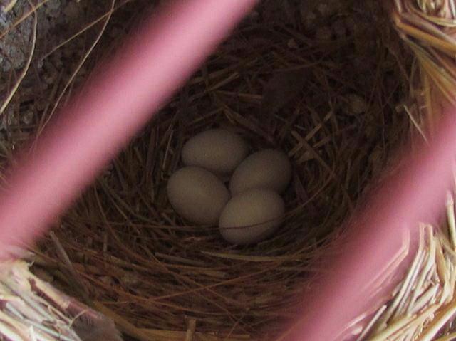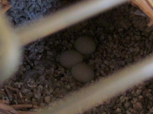 おそらく二羽が無事に孵化していると思われる。 残りの卵のうち、一つは比較的最近産んでいるので、今の雛がだいぶ大きくなった頃に孵化するかも。 ついでに、竹かご三人衆(三羽衆)を撮影。 |