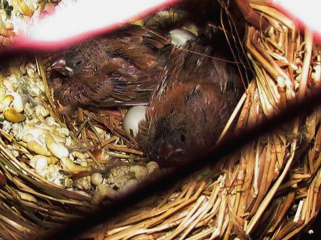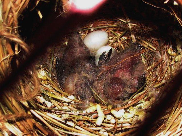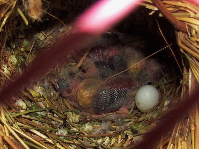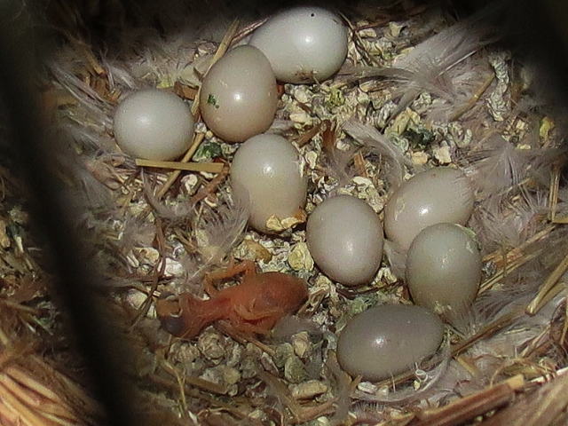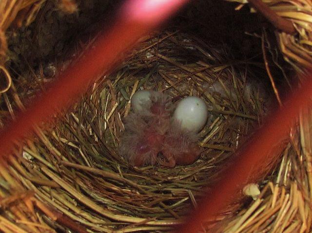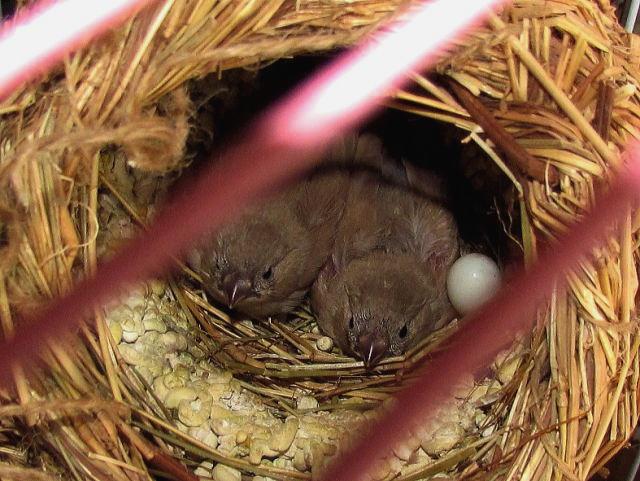 六個… どんだけ産むの(汗) 最近温めてるのか、巣の中にいることが多いので、一個くらいはもしかしたら孵化するかも? でも、白チームは兄弟のような気がするんだよな… 違うのかな? ちょんとりんの雛は順調に育っている。 卵の二つはまだ孵化していない。 下画像の一枚目は昨日、二枚目は本日。 昨日、だいぶ羽の感じがしっかりしてきたなと思ってたら、今日は一羽が僅かながら目を開いた。 毎日少しずつ雛の声が大きくなってきている。 これから賑やかになりそうだ。 |