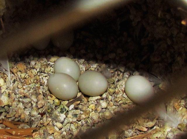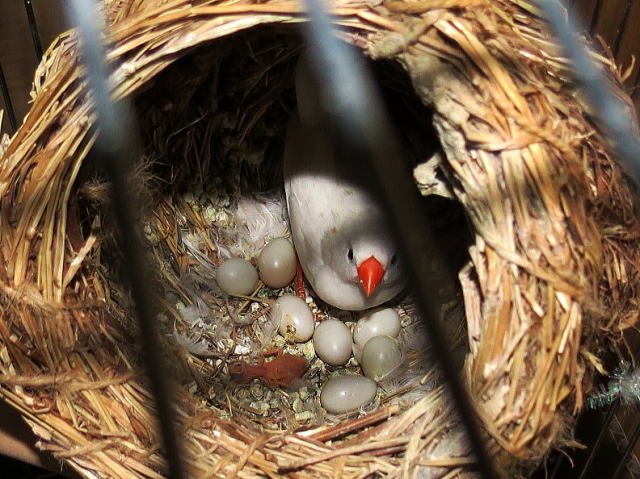そして、ぷっぷ・ぽっぽ・ぺっぺの白チーム。 ぷっぷが雄でぽっぽが雌と確定。 ぺっぺが未だに判別できず。 嘴がなんとなく赤っぽく見えるけどそんなに濃くないし、雄特有の鳴き方をしないので雌なのかも。 そんな白チームの巣の中に卵を発見。 まったく温める様子もなく遊びまくり。 今日見てみると3つに増えていた。 こちらはおそらく孵化することはないと思われる。 |