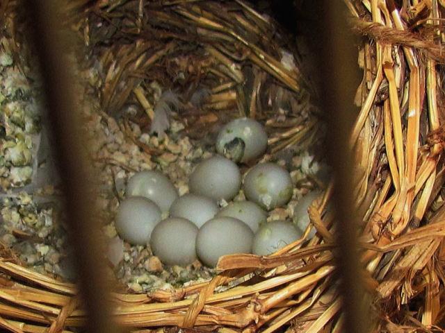 2012.4.10 白チーム、2月のいっぱいあった卵は撤去した。 しかし、現在も10個ほど巣の中に。 今回は前回と違い、雌がよく温めていた。 もしかしたらと思っていたけど… |